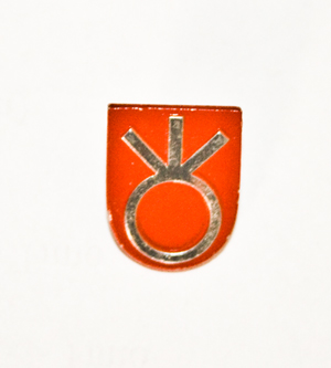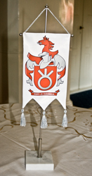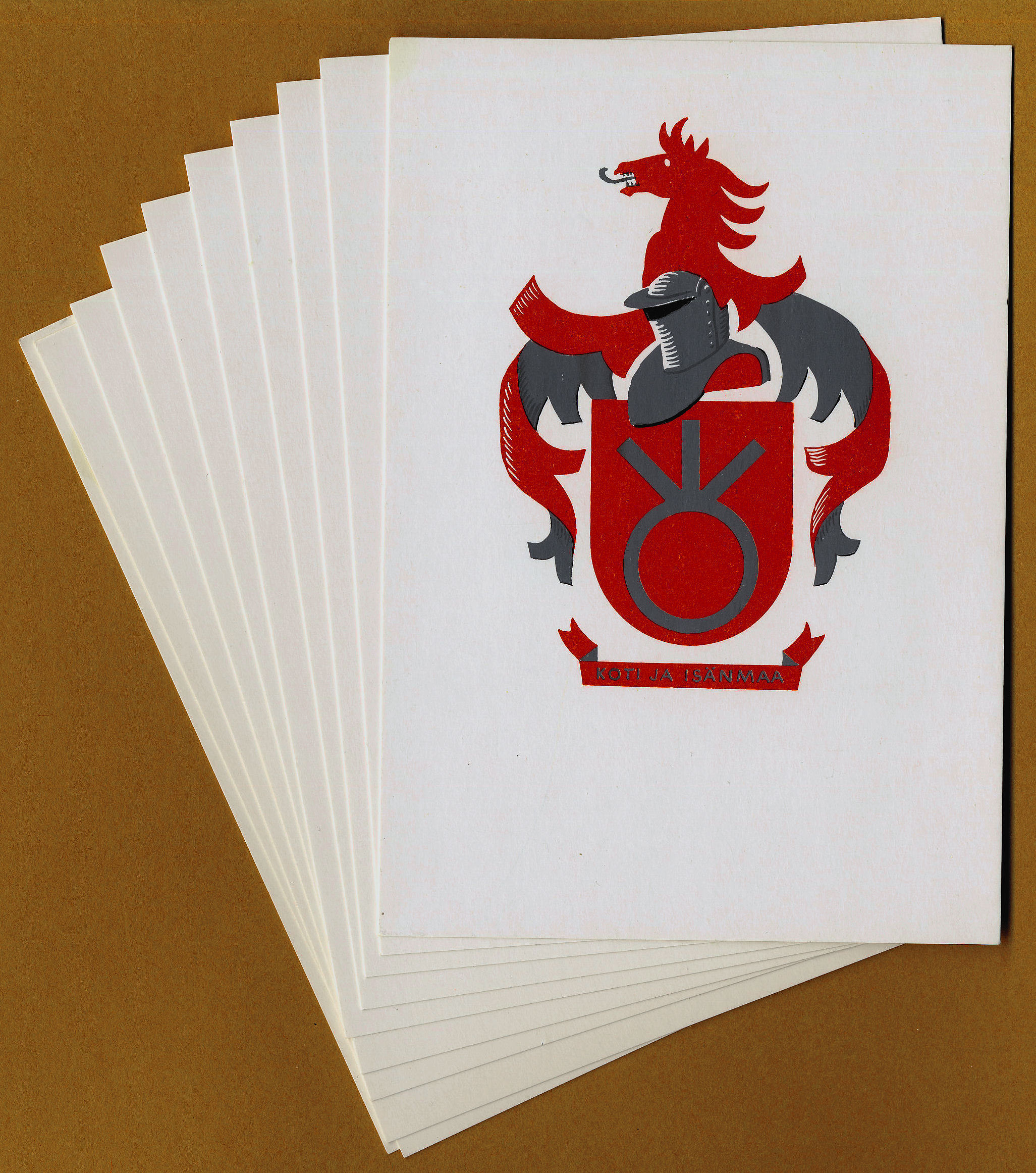 Kannassa sukuseuran vaakunan kilpikuvio,